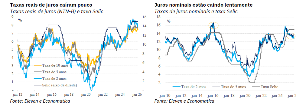reais (gráfico da esquerda) caíram pouco. Enquanto as taxas nominais caíram mais