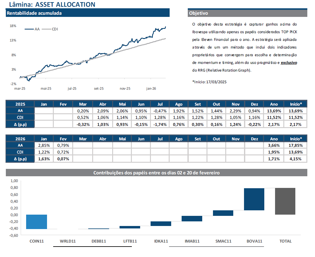 Nossa alocação padrão rendeu 3,7% em 2026, 1,8pp acima do CDI como pode